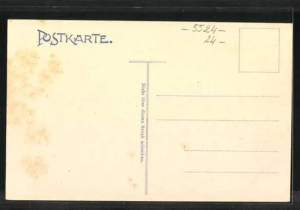 Personenbezogene Daten auf der Rückseite der Karte wurden durch blauen Textmarker unkenntlich gemacht. Die blauen Stellen sind auf die Vorderseite durchgeweicht und wirken sich negativ auf das Postkartenfoto aus