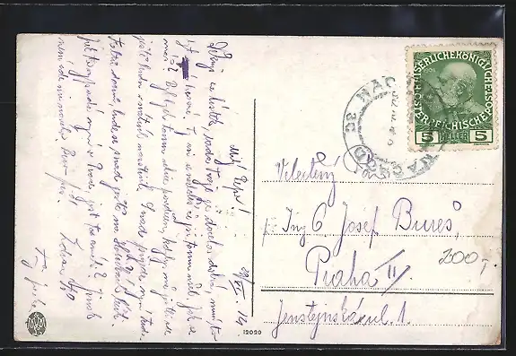Personenbezogene Daten auf der Rückseite der Karte wurden durch blauen Textmarker unkenntlich gemacht. Die blauen Stellen sind auf die Vorderseite durchgeweicht und wirken sich negativ auf das Postkartenfoto aus