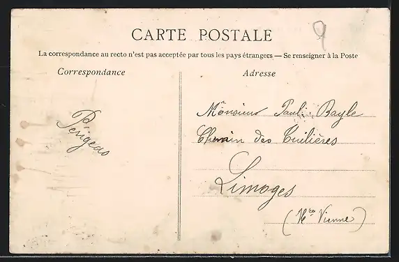 Personenbezogene Daten auf der Rückseite der Karte wurden durch blauen Textmarker unkenntlich gemacht. Die blauen Stellen sind auf die Vorderseite durchgeweicht und wirken sich negativ auf das Postkartenfoto aus