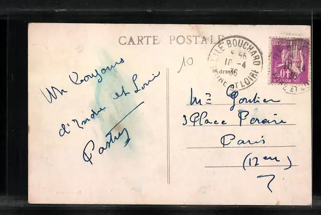 Personenbezogene Daten auf der Rückseite der Karte wurden durch blauen Textmarker unkenntlich gemacht. Die blauen Stellen sind auf die Vorderseite durchgeweicht und wirken sich negativ auf das Postkartenfoto aus