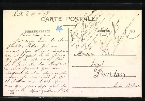 Personenbezogene Daten auf der Rückseite der Karte wurden durch blauen Textmarker unkenntlich gemacht. Die blauen Stellen sind auf die Vorderseite durchgeweicht und wirken sich negativ auf das Postkartenfoto aus