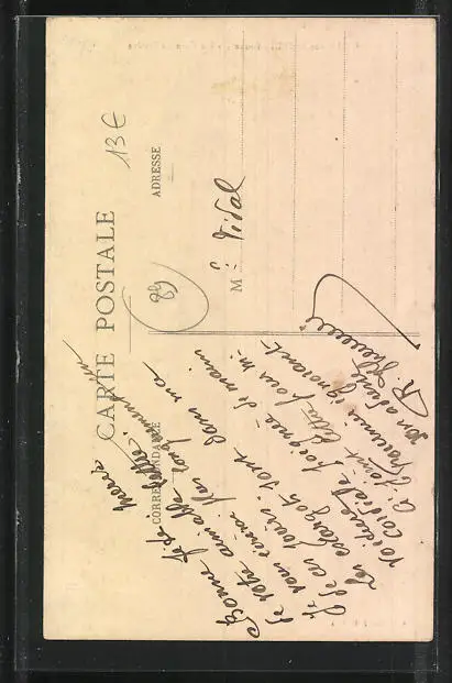 Personenbezogene Daten auf der Rückseite der Karte wurden durch blauen Textmarker unkenntlich gemacht. Die blauen Stellen sind auf die Vorderseite durchgeweicht und wirken sich negativ auf das Postkartenfoto aus