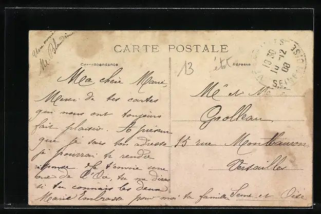 Personenbezogene Daten auf der Rückseite der Karte wurden durch blauen Textmarker unkenntlich gemacht. Die blauen Stellen sind auf die Vorderseite durchgeweicht und wirken sich negativ auf das Postkartenfoto aus
