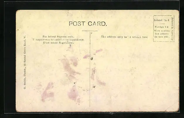 Personenbezogene Daten auf der Rückseite der Karte wurden durch blauen Textmarker unkenntlich gemacht. Die blauen Stellen sind auf die Vorderseite durchgeweicht und wirken sich negativ auf das Postkartenfoto aus