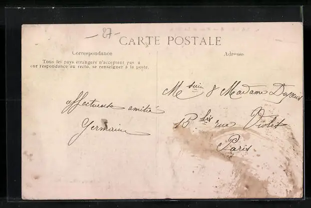Personenbezogene Daten auf der Rückseite der Karte wurden durch blauen Textmarker unkenntlich gemacht. Die blauen Stellen sind auf die Vorderseite durchgeweicht und wirken sich negativ auf das Postkartenfoto aus