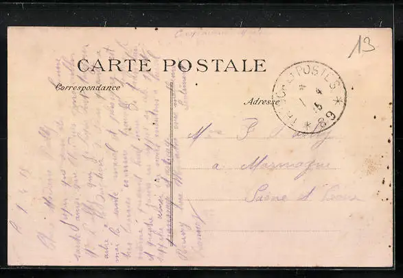 Personenbezogene Daten auf der Rückseite der Karte wurden durch blauen Textmarker unkenntlich gemacht. Die blauen Stellen sind auf die Vorderseite durchgeweicht und wirken sich negativ auf das Postkartenfoto aus