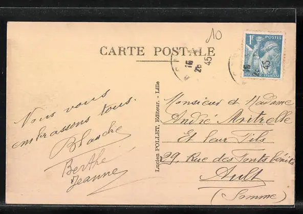 Personenbezogene Daten auf der Rückseite der Karte wurden durch blauen Textmarker unkenntlich gemacht. Die blauen Stellen sind auf die Vorderseite durchgeweicht und wirken sich negativ auf das Postkartenfoto aus