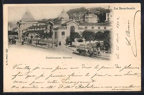 AK La Bourboule, Établissement Thermal et calèche devant le bâtiment