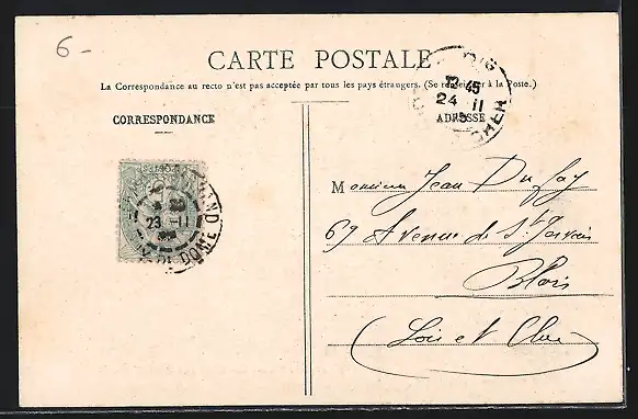 Personenbezogene Daten auf der Rückseite der Karte wurden durch blauen Textmarker unkenntlich gemacht. Die blauen Stellen sind auf die Vorderseite durchgeweicht und wirken sich negativ auf das Postkartenfoto aus