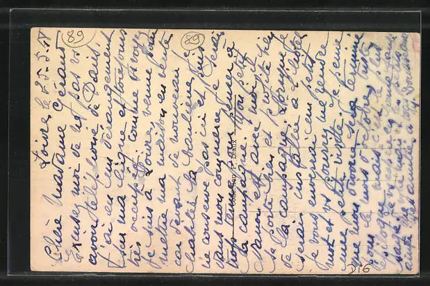 Personenbezogene Daten auf der Rückseite der Karte wurden durch blauen Textmarker unkenntlich gemacht. Die blauen Stellen sind auf die Vorderseite durchgeweicht und wirken sich negativ auf das Postkartenfoto aus