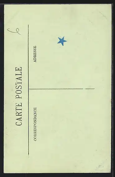 Personenbezogene Daten auf der Rückseite der Karte wurden durch blauen Textmarker unkenntlich gemacht. Die blauen Stellen sind auf die Vorderseite durchgeweicht und wirken sich negativ auf das Postkartenfoto aus