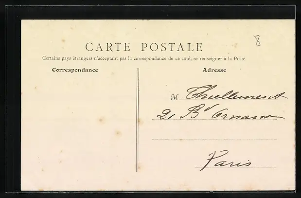 Personenbezogene Daten auf der Rückseite der Karte wurden durch blauen Textmarker unkenntlich gemacht. Die blauen Stellen sind auf die Vorderseite durchgeweicht und wirken sich negativ auf das Postkartenfoto aus