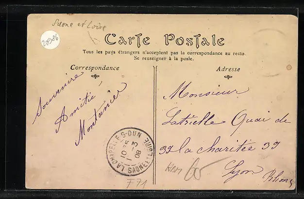 Personenbezogene Daten auf der Rückseite der Karte wurden durch blauen Textmarker unkenntlich gemacht. Die blauen Stellen sind auf die Vorderseite durchgeweicht und wirken sich negativ auf das Postkartenfoto aus