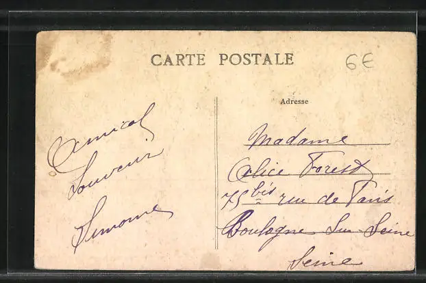 Personenbezogene Daten auf der Rückseite der Karte wurden durch blauen Textmarker unkenntlich gemacht. Die blauen Stellen sind auf die Vorderseite durchgeweicht und wirken sich negativ auf das Postkartenfoto aus