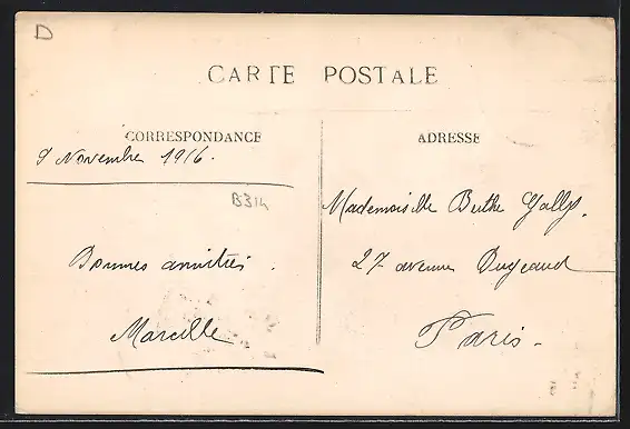 Personenbezogene Daten auf der Rückseite der Karte wurden durch blauen Textmarker unkenntlich gemacht. Die blauen Stellen sind auf die Vorderseite durchgeweicht und wirken sich negativ auf das Postkartenfoto aus