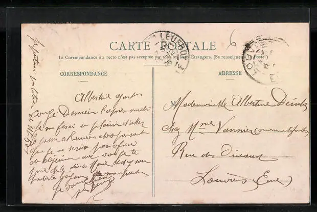 Personenbezogene Daten auf der Rückseite der Karte wurden durch blauen Textmarker unkenntlich gemacht. Die blauen Stellen sind auf die Vorderseite durchgeweicht und wirken sich negativ auf das Postkartenfoto aus