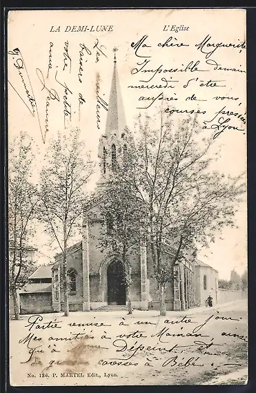 AK La Demi-Lune, L`Église vue de face avec arbres en avant-plan