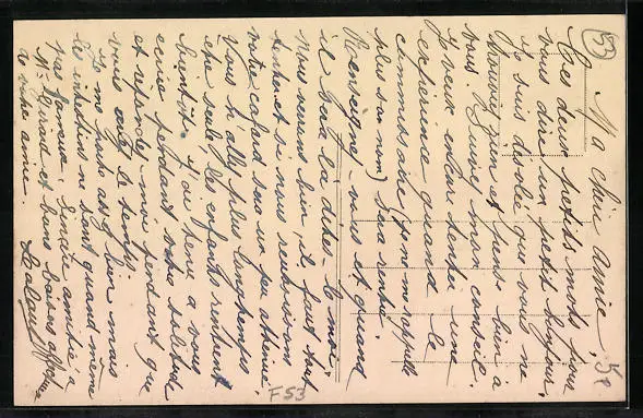 Personenbezogene Daten auf der Rückseite der Karte wurden durch blauen Textmarker unkenntlich gemacht. Die blauen Stellen sind auf die Vorderseite durchgeweicht und wirken sich negativ auf das Postkartenfoto aus
