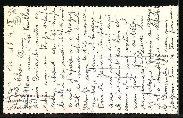 Personenbezogene Daten auf der Rückseite der Karte wurden durch blauen Textmarker unkenntlich gemacht. Die blauen Stellen sind auf die Vorderseite durchgeweicht und wirken sich negativ auf das Postkartenfoto aus