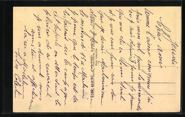 Personenbezogene Daten auf der Rückseite der Karte wurden durch blauen Textmarker unkenntlich gemacht. Die blauen Stellen sind auf die Vorderseite durchgeweicht und wirken sich negativ auf das Postkartenfoto aus