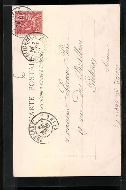 Personenbezogene Daten auf der Rückseite der Karte wurden durch blauen Textmarker unkenntlich gemacht. Die blauen Stellen sind auf die Vorderseite durchgeweicht und wirken sich negativ auf das Postkartenfoto aus