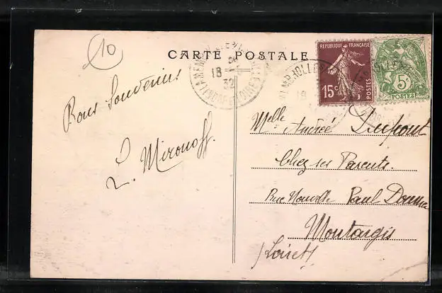 Personenbezogene Daten auf der Rückseite der Karte wurden durch blauen Textmarker unkenntlich gemacht. Die blauen Stellen sind auf die Vorderseite durchgeweicht und wirken sich negativ auf das Postkartenfoto aus