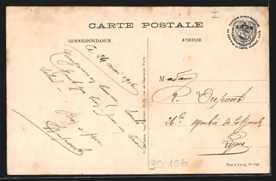 Personenbezogene Daten auf der Rückseite der Karte wurden durch blauen Textmarker unkenntlich gemacht. Die blauen Stellen sind auf die Vorderseite durchgeweicht und wirken sich negativ auf das Postkartenfoto aus