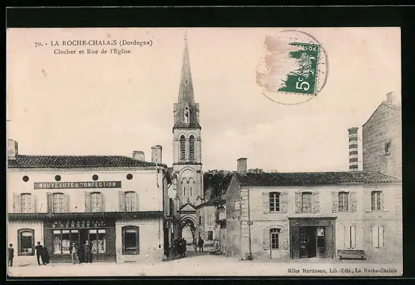 AK La Roche-Chalais, Clocher et Rue de l`Eglise