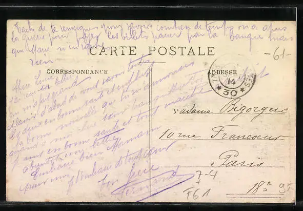 Personenbezogene Daten auf der Rückseite der Karte wurden durch blauen Textmarker unkenntlich gemacht. Die blauen Stellen sind auf die Vorderseite durchgeweicht und wirken sich negativ auf das Postkartenfoto aus