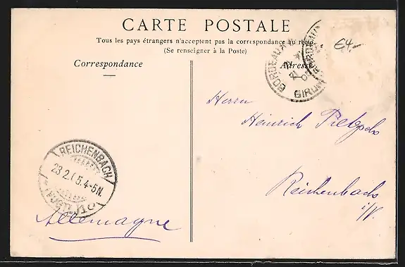 Personenbezogene Daten auf der Rückseite der Karte wurden durch blauen Textmarker unkenntlich gemacht. Die blauen Stellen sind auf die Vorderseite durchgeweicht und wirken sich negativ auf das Postkartenfoto aus