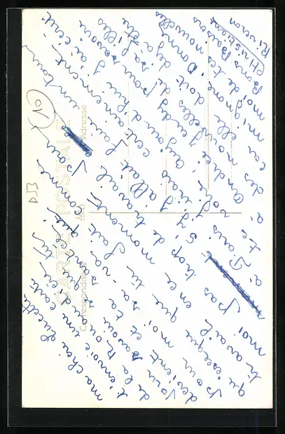 Personenbezogene Daten auf der Rückseite der Karte wurden durch blauen Textmarker unkenntlich gemacht. Die blauen Stellen sind auf die Vorderseite durchgeweicht und wirken sich negativ auf das Postkartenfoto aus