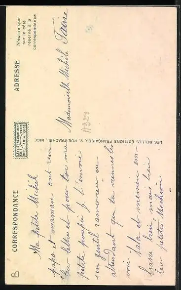 Personenbezogene Daten auf der Rückseite der Karte wurden durch blauen Textmarker unkenntlich gemacht. Die blauen Stellen sind auf die Vorderseite durchgeweicht und wirken sich negativ auf das Postkartenfoto aus