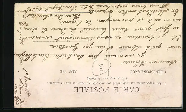 Personenbezogene Daten auf der Rückseite der Karte wurden durch blauen Textmarker unkenntlich gemacht. Die blauen Stellen sind auf die Vorderseite durchgeweicht und wirken sich negativ auf das Postkartenfoto aus