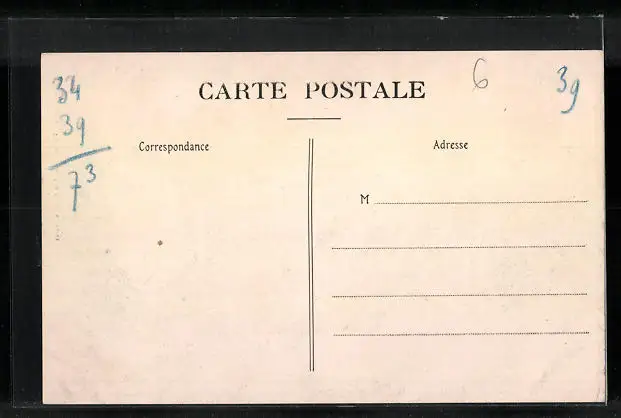 Personenbezogene Daten auf der Rückseite der Karte wurden durch blauen Textmarker unkenntlich gemacht. Die blauen Stellen sind auf die Vorderseite durchgeweicht und wirken sich negativ auf das Postkartenfoto aus