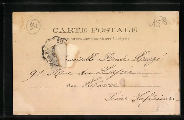 Personenbezogene Daten auf der Rückseite der Karte wurden durch blauen Textmarker unkenntlich gemacht. Die blauen Stellen sind auf die Vorderseite durchgeweicht und wirken sich negativ auf das Postkartenfoto aus