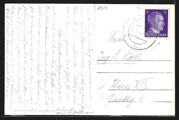 Personenbezogene Daten auf der Rückseite der Karte wurden durch blauen Textmarker unkenntlich gemacht. Die blauen Stellen sind auf die Vorderseite durchgeweicht und wirken sich negativ auf das Postkartenfoto aus
