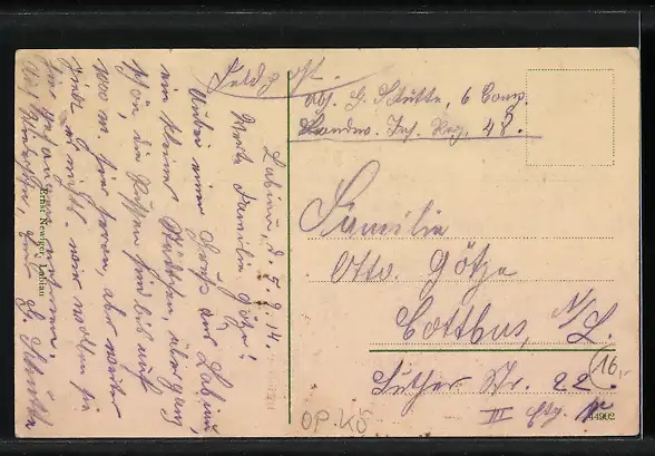 Personenbezogene Daten auf der Rückseite der Karte wurden durch blauen Textmarker unkenntlich gemacht. Die blauen Stellen sind auf die Vorderseite durchgeweicht und wirken sich negativ auf das Postkartenfoto aus