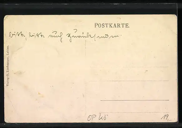 Personenbezogene Daten auf der Rückseite der Karte wurden durch blauen Textmarker unkenntlich gemacht. Die blauen Stellen sind auf die Vorderseite durchgeweicht und wirken sich negativ auf das Postkartenfoto aus