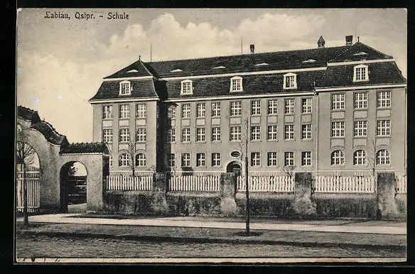 AK Labiau, Schule mit Toreingang, Strassenansicht
