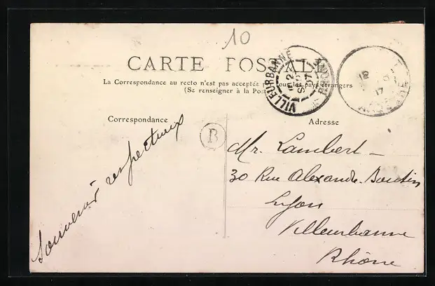 Personenbezogene Daten auf der Rückseite der Karte wurden durch blauen Textmarker unkenntlich gemacht. Die blauen Stellen sind auf die Vorderseite durchgeweicht und wirken sich negativ auf das Postkartenfoto aus