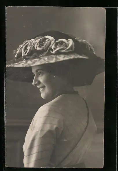 AK Lächelnde Dame mit einem Rosenverzierten Hut