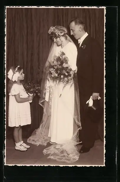 AK Lächelndes Hochzeitspaar mit Blumenmädchen