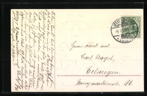 Personenbezogene Daten auf der Rückseite der Karte wurden durch blauen Textmarker unkenntlich gemacht. Die blauen Stellen sind auf die Vorderseite durchgeweicht und wirken sich negativ auf das Postkartenfoto aus