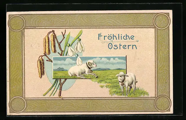 AK Lämmer zu Ostern auf einer Weide mit Osterglöckchen