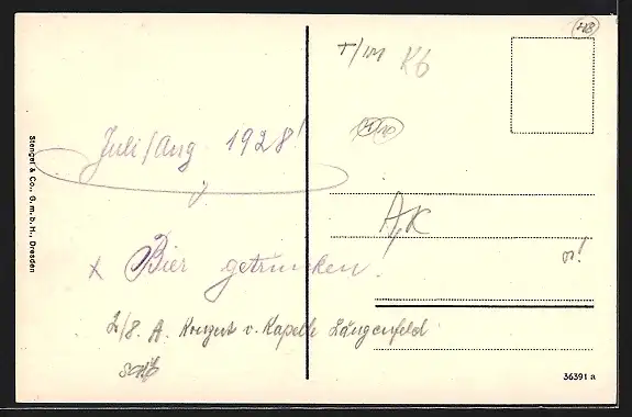Personenbezogene Daten auf der Rückseite der Karte wurden durch blauen Textmarker unkenntlich gemacht. Die blauen Stellen sind auf die Vorderseite durchgeweicht und wirken sich negativ auf das Postkartenfoto aus