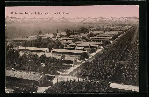 AK Lager Lechfeld, Ansicht des Truppenübungsplatz mit Baracken aus der Vogelschau