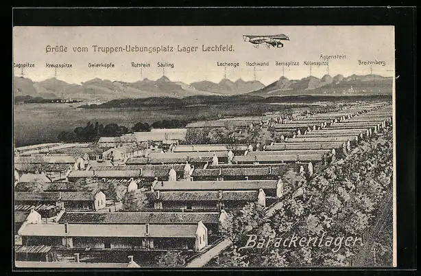 AK Lager Lechfeld, Brackenlager, Doppeldeckerflugzeug