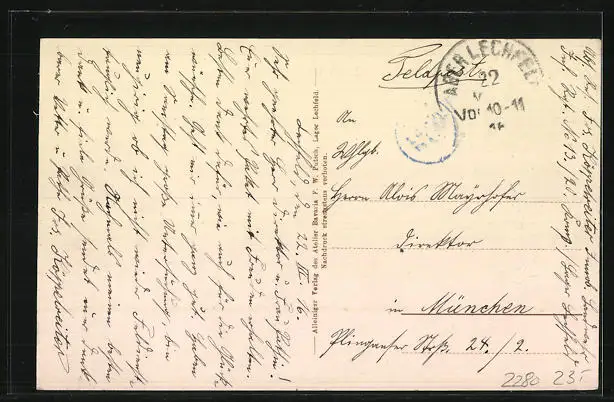 Personenbezogene Daten auf der Rückseite der Karte wurden durch blauen Textmarker unkenntlich gemacht. Die blauen Stellen sind auf die Vorderseite durchgeweicht und wirken sich negativ auf das Postkartenfoto aus