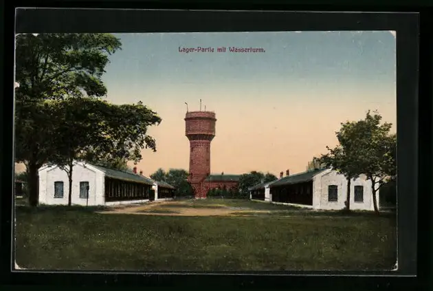 AK Lager Lechfeld, Truppenübungsplatz, Lager-Partie mit Wasserturm