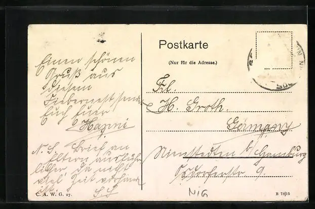 alte Ansichtskarte, gelaufen, Briefmarke entfernt, rückseitig Oberflächenschaden, leicht fleckig, guter Zustand